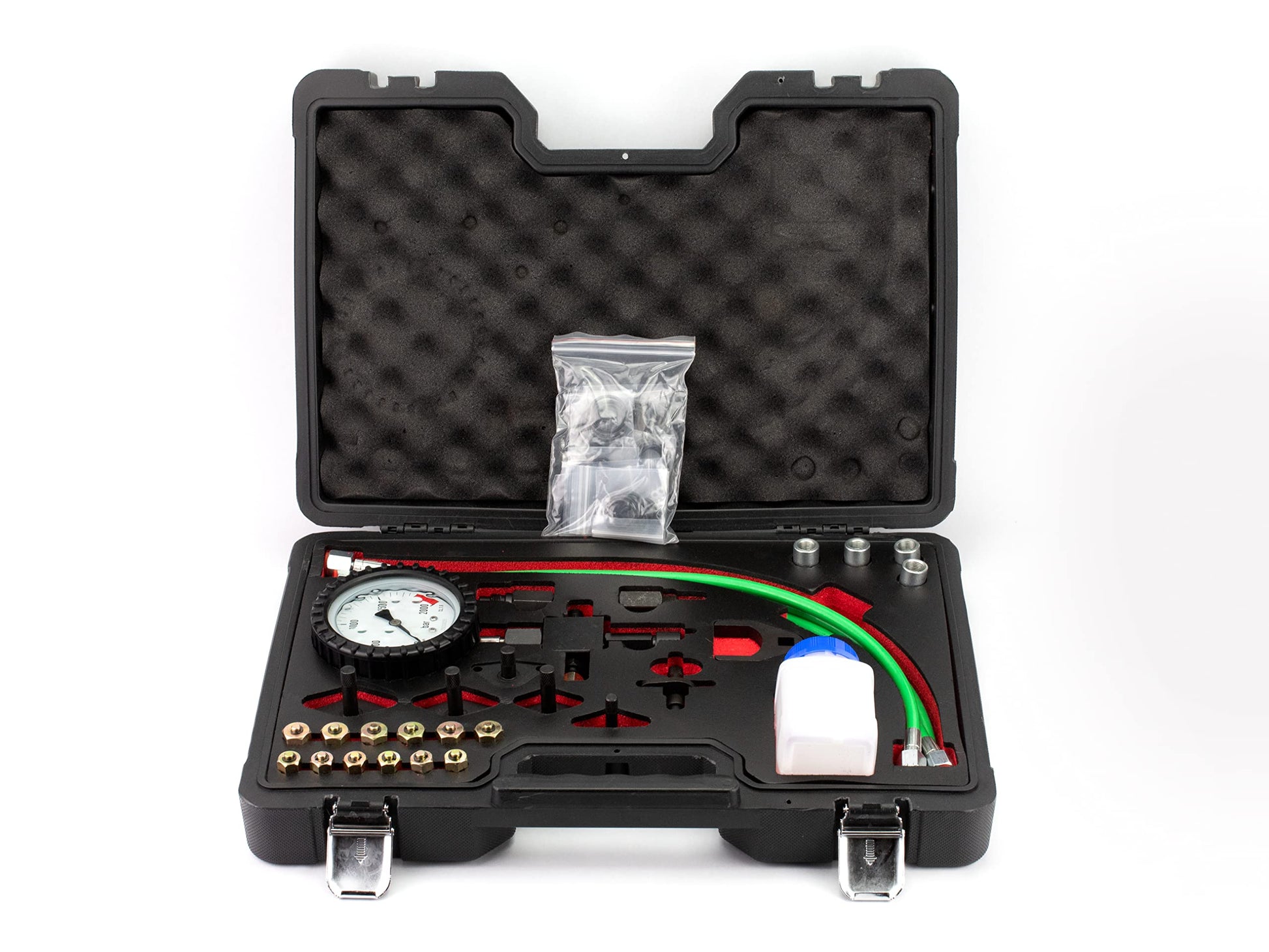 - El probador puede comprobar la presión real en el circuito de alta presión en el sistema común del carril usando un manómetro de alta presión (2000 bar) y mangueras flexibles de alta presión. El kit también incluye un conjunto de regulador de bomba ficticia y piezas de tubo inyector. Para una variedad de pruebas: -Prueba de presión de arranque/funcionamiento del motor -Prueba de presión máxima de la bomba -Prueba del regulador de presión de la bomba -Prueba de fugas del inyector